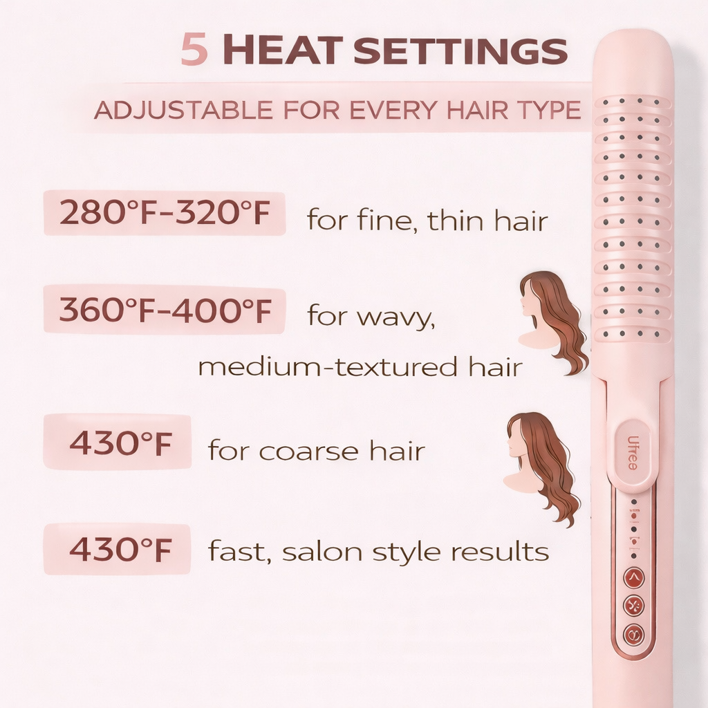 Ufree™ Airflow Curling Iron and Straightener is one of the best styling tools to purchase because it combines two essential tools into one convenient device. With fast heat-up technology, you can start styling within secondssaving time during busy mornings while still achieving salon-quality results. The plates heat evenly across the hair, helping prevent hot spots and reducing the risk of heat damage while giving smooth, consistent styling.  A tool with five different temperature settings allows you to customize the heat for fine, medium, or thick hair, ensuring safer styling and better results. With its ability to straighten or curl while locking the style in place, this versatile tool helps keep your hair looking polished and styled for up to 24 hours.